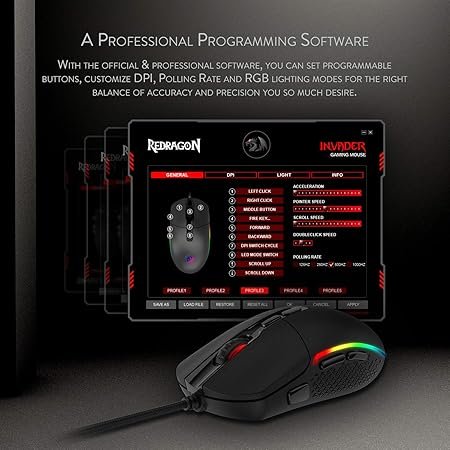 • Mouse Gamer Redragon Invader – 10000dpi – 7 Botões – LED RGB – M719-RGB